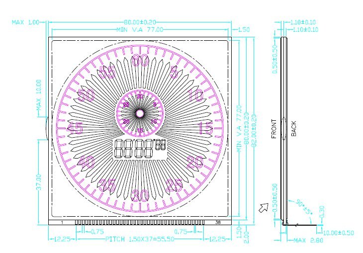 We finally get the parallel edge where conductive rubber strip or zebra can be installed. We can see that the parallel edge of LCD is only 25 mm. But how many segments do we have? 60 seconds segments + 30 minutes segments + 6*typical 7-segment digitals=132 segments. Duty is 1/4, 132/4+4=37 pieces of legs. There are 4 commonly used types of pitches for PINs: 1.27 mm, 1.5 mm, 2.0 mm, and 2.54 mm. There is no enough space (37*1.27=46.99 mm) to install PINs. But the minimum pitch of conductive rubber strip or zebra is 0.3 mm or 0.4 mm, therefore there is enough space (37*0.4=14.8 mm).
