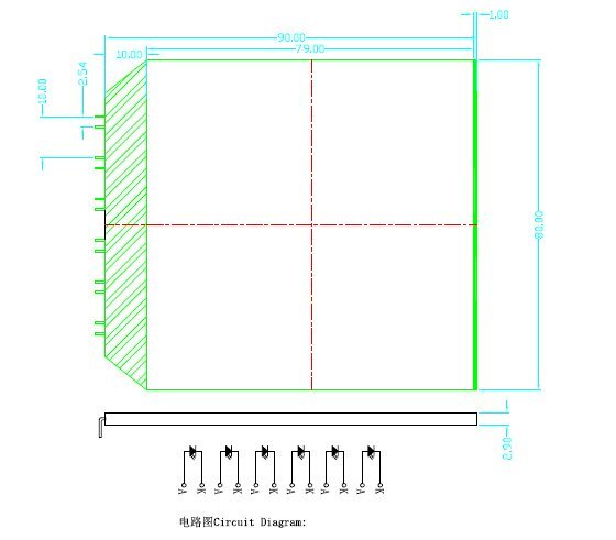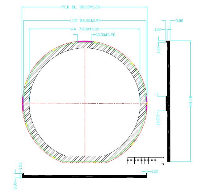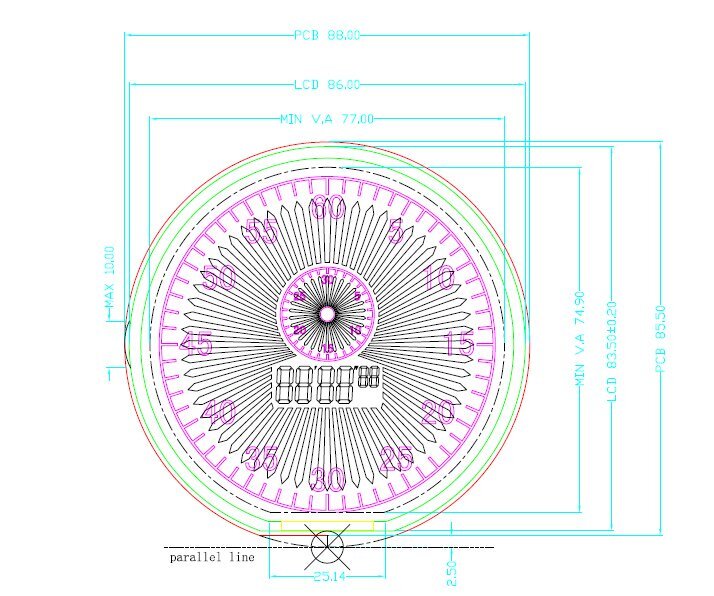 How can we make it so small? First, we confirm the view area 77*77 mm. Second, expand it 1.5 mm which is the minimum distance between the edge of LCD screen and view area. Third, expand it by 2.0 mm which is the distance between upper ITO glass and lower ITO glass. I marked the upper and lower ITO glasses with green lines.Fourth, expand it 1.0 mm which is the width and height of walls. Fifth, if I didn’t make a mistake, the LCD screen, LED backlight and PCB should be all round. As we know, LED backlight and PCB can be round, but not LCD screen. If LCD screen is round, what kind of connection should be used? Metal pin, zebra or conductive rubber strip can’t be installed in the round edge. Find the middle point at the bottom of LCD screen, draw a parallel line and move it up 2.5 mm, and we cut it along with the line, that is the edge of PCB. Move it up 1.0 mm and 2.0 mm, that is the edge of LCD screen. Move it up to 1.5 mm, that is the view area.