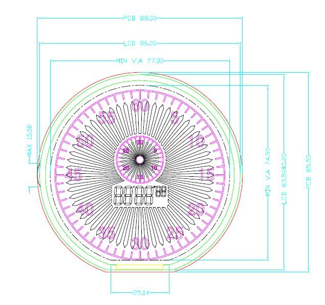 How can we make it so small? First, we confirm the view area 77*77 mm. Second, expand it 1.5 mm which is the minimum distance between the edge of LCD screen and view area. Third, expand it by 2.0 mm which is the distance between upper ITO glass and lower ITO glass. I marked the upper and lower ITO glasses with green lines.Fourth, expand it 1.0 mm which is the width and height of walls. Fifth, if I didn’t make a mistake, the LCD screen, LED backlight and PCB should be all round. As we know, LED backlight and PCB can be round, but not LCD screen. If LCD screen is round, what kind of connection should be used? Metal pin, zebra or conductive rubber strip can’t be installed in the round edge. Find the middle point at the bottom of LCD screen, draw a parallel line and move it up 2.5 mm, and we cut it along with the line, that is the edge of PCB. Move it up 1.0 mm and 2.0 mm, that is the edge of LCD screen. Move it up to 1.5 mm, that is the view area.