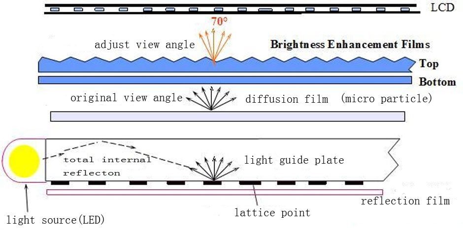 Diffusion film achieves the function of diffusing light by the microparticles (beads) which attach at the surface of the optical film material. Meanwhile, the brightness enhancement film (prism sheet) not only can redistribute the light and improve the light transmittance, but also can increase the brightness and viewing angle of the light by transparent optical micro stripes (raster).