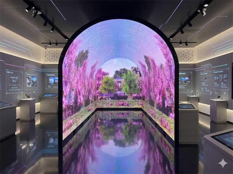 • The Flexible Advantage: Standardized 320x160mm modules were used to wrap this indoor column, achieving a perfect fit with a bending radius as tight as 250mm. With flatness ≥98%, the installation ensures a continuous 360° viewing experience without visible vertical seams or dark lines.