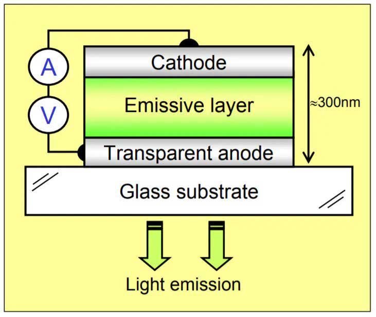 OLED’s basic structure is making a layer of organic light-emitting material of tens of nanometers thick as a light-emitting layer on indium tin oxide (ITO) glass. Above the light-emitting layer is a layer of low power function of the metal electrode, forming a sandwich structure.
