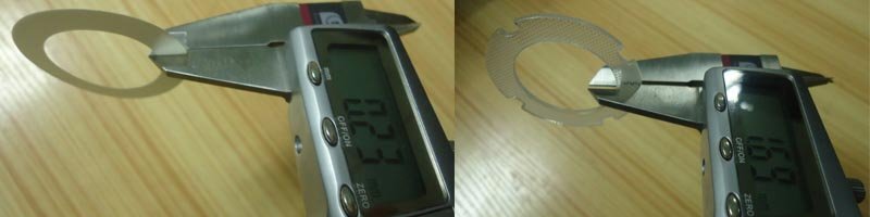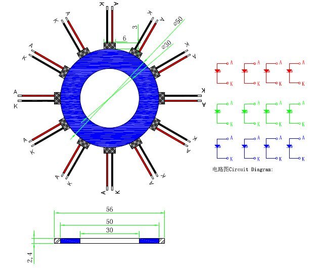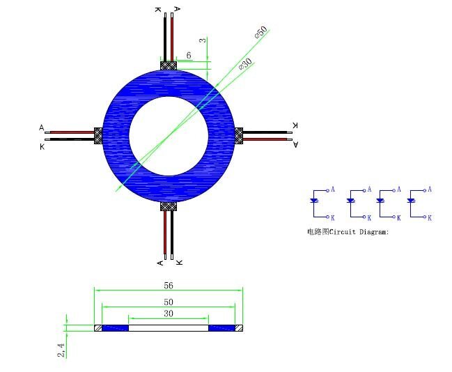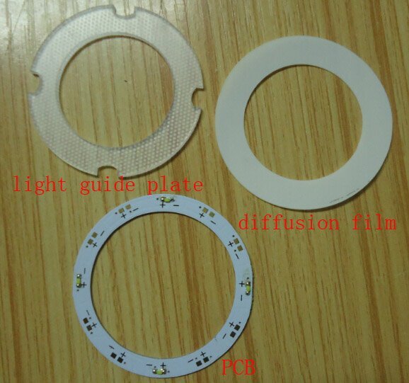 It is a blue ring LED backlight, there is a hole in the middle, 3 mm light shade area. 4 SMD LEDs in the 4 corners: 12 o’clock, 3 o’clock, 6 o’clock and 9 o’clock position. We use 2.0 mm light guide plate and the total thickness of LED backlight is 2.4 mm. The view area looks like a ring, but the defect of this design is obvious that there are 4 redundant light shade areas. It does not look very round. The advantage of this design is that we can use the existing PCB no matter what the sizes it may be.