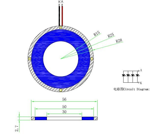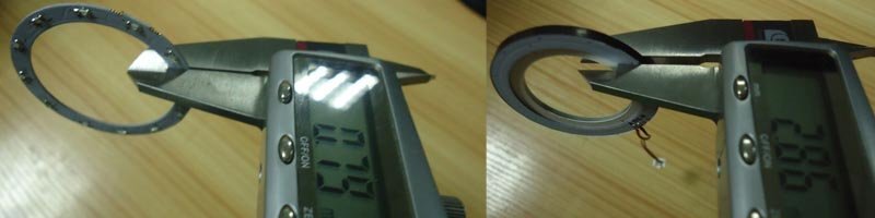 It looks exactly like a ring with two wires. 3 mm light shade area and 10 mm active area (illumination area). 4 SMD LEDs are parallelly connected. We use 1.5 mm light guide plate, 0.8 mm PCB and 0.2 mm diffusion film to make this LED backlight, so the total thickness is about 2.7 ~ 2.8 mm. The disadvantage of this design is that if we change the size, we have to make a new dedicated PCB.
