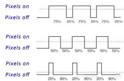 In PWM (Pulse Width Modulation) dimming, the power is not changed, but the screen flickers alternately in a very short time with a specific frequency of “on → off → on → off”. By adjusting the time ratio of “on” and “off”, the screen brightness level can be adjusted from 0% to 100%.